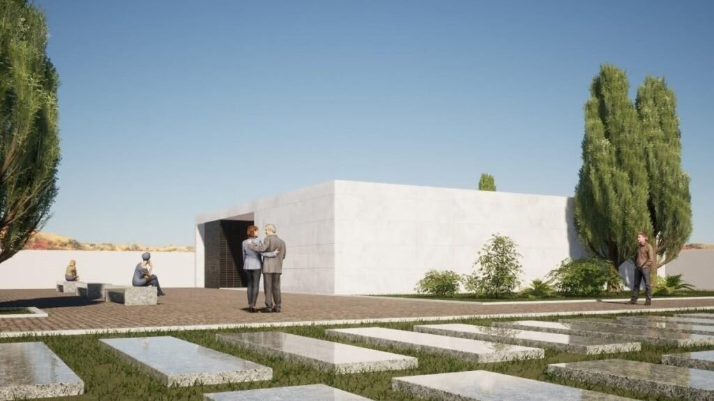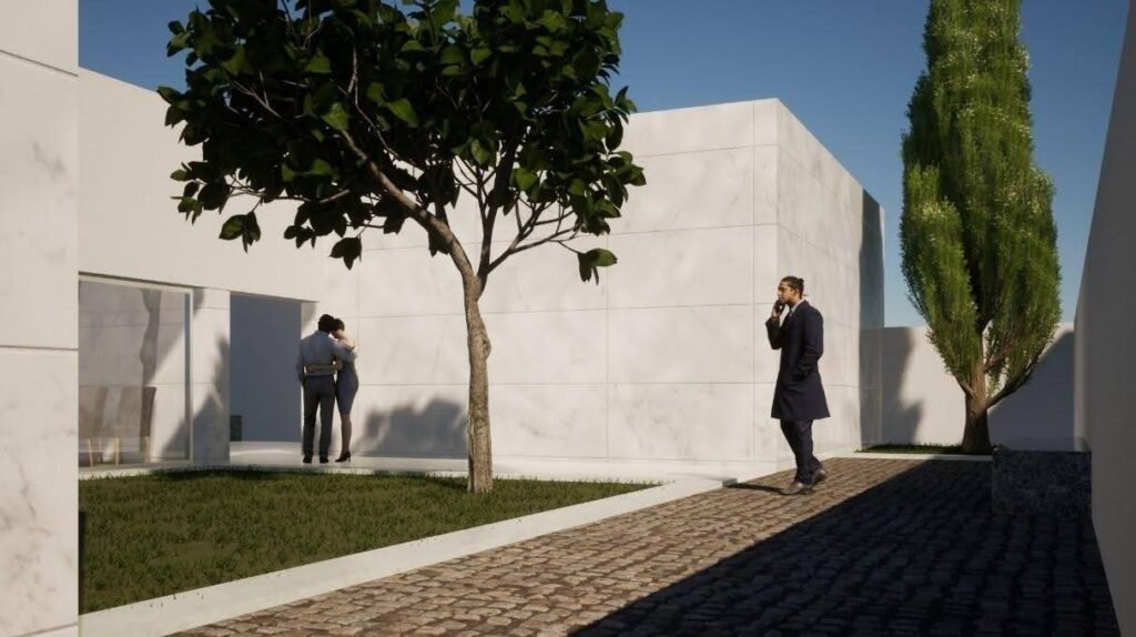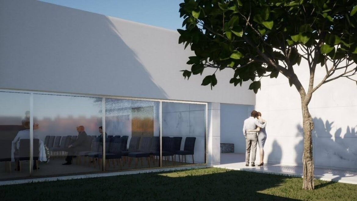• Conceito Arquitetónico (Yin-Yang): O projeto materializa a dualidade entre vida e morte através do contraste de luz, sombra e materiais. Destaca-se o uso de mármore branco nas fachadas em oposição a interiores escuros, e o calor da madeira nas salas de velório em contraste com o frio da pedra.