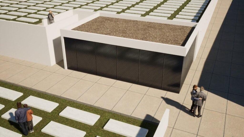 • Acessibilidade: Implementação de rampas longitudinais e escadas para acesso aos talhões, garantindo fluidez na circulação pedonal. Foi também previsto um espaço específico de 15 m2 em cada talhão para o armazenamento de pedras tumulares.